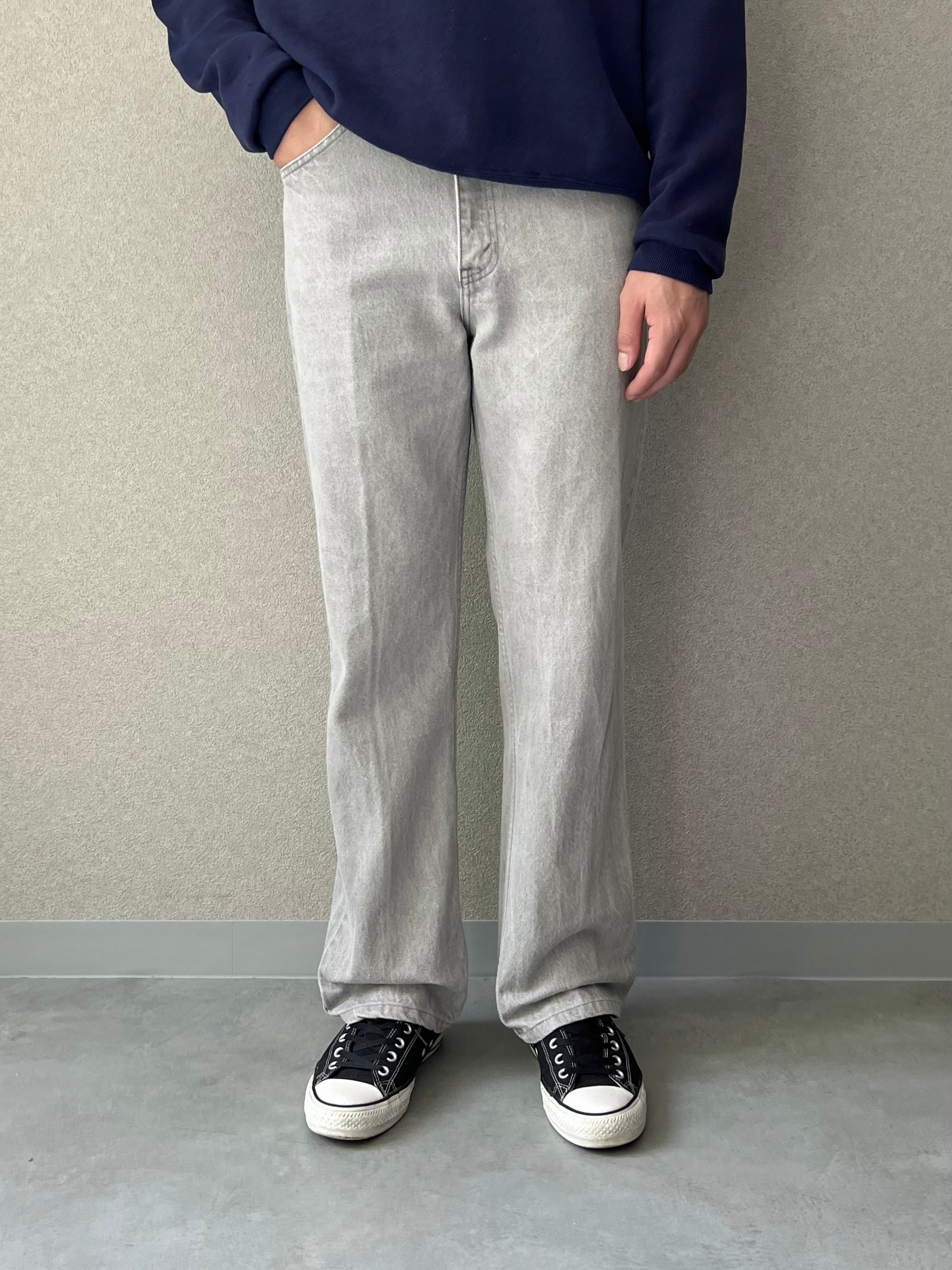珍しい先染めのグレーデニム、カラーデニムは基本的に後染めの物が9割以上を占めますが先染めのグレーはレアいしファッション的にも◎