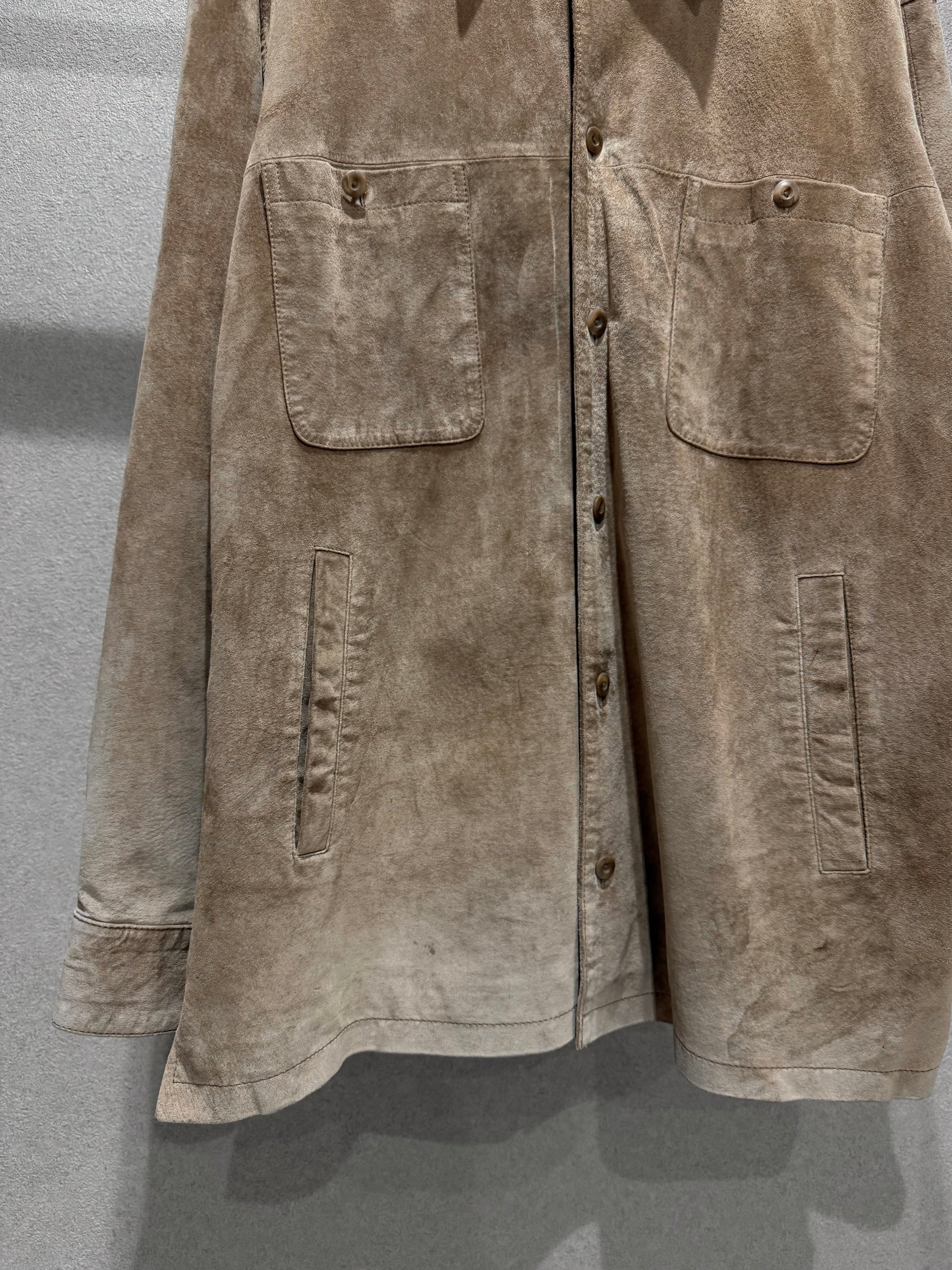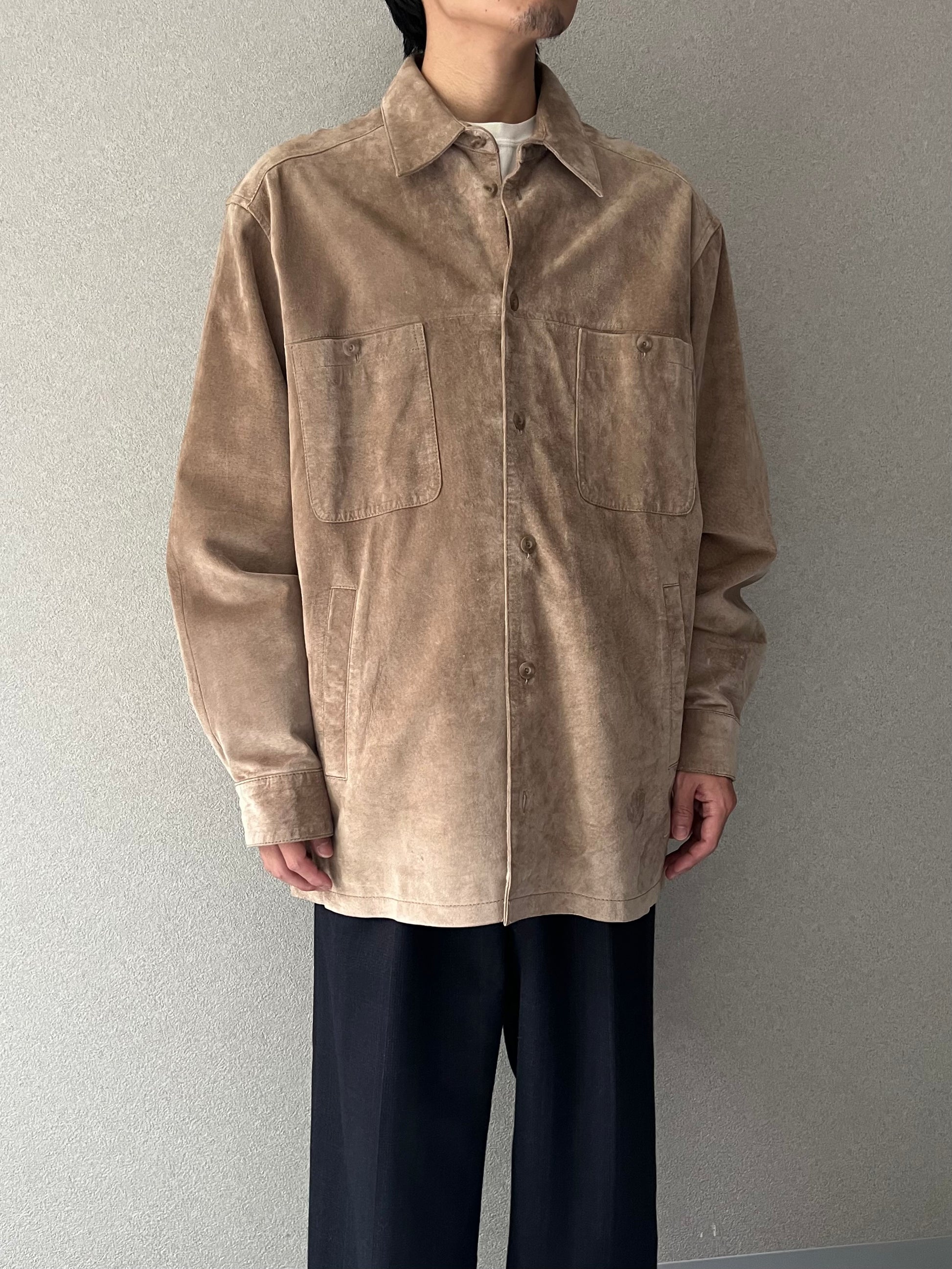 カバーオールを彷彿とさせるフロントポケットがアクセント。このポケットディテールにより、重厚なレザージャケットではなく、ライトなシャツジャケット感覚で気負いなく着用いただけます。